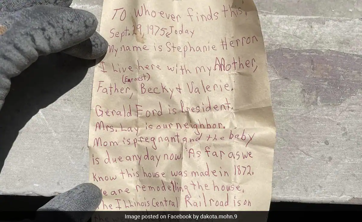 डकोटा (Dakota Mohn) नाम का ये कारपेंटर (carpenter) घर का मेंटेनेंस कर रहा था, इस दौरान उसकी नजर लिविंग रूम की दीवार के ढांचे पर पड़ी, जिस पर लिखा था, ‘नोट 9/29/1975.’ वहां बनाएं ऐरो को फॉलो करते हुए जब उसने लकड़ी के बने उस कंपार्टमेंट को खोला, तो वहां बंद बोतल में हाथ से लिखा एक लेटर उसे मिला. पोस्ट के कैप्शन में डकोटा ने लिखा है, ‘बढ़ई के रूप में अपने करियर में मुझे बहुत सी अच्छी चीजें मिलीं, लेकिन यह उनमें सबसे ऊपर है.डकोटा मोहन ने कहा, ‘मेरी टीम वहां घर के सामने के लिविंग रूम को तोड़ रही थी. मैं मलबा साफ कर रहा था और मैंने ऊपर देखा, तो दीवार पर कुछ लिखा हुआ था, जिस पर ‘नोट’ लिखा था. मैंने अपना सेल फोन वहां फंसाया और एक तस्वीर ली और इसे इस बोतल में देखा. इसे बाहर निकाला और नोट पढ़ा.’